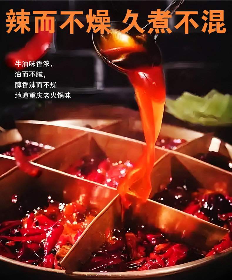 【配料】牛油、植物油、肉味提取物、味精、食盐、白糖、豆瓣、豆豉、辣椒、香辛料、植物蛋白液、食品添加剂(食用香精、山梨酸钾、呈味核苷酸二钠)