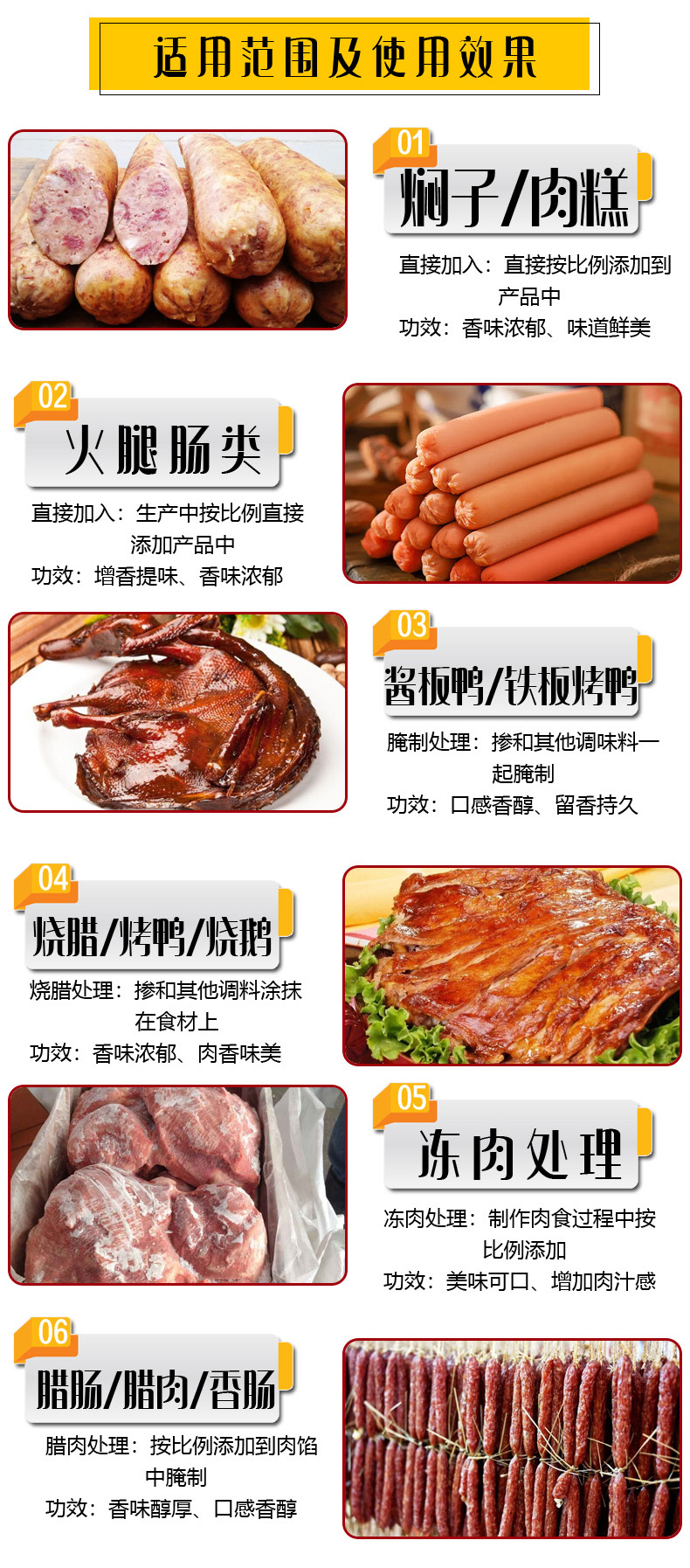 【使用范围】广泛用于酱卤肉制品、豆制品、焖子制品、汤料、调味料、小食品、风味小食品、香肠、罐头等食品提鲜加香。