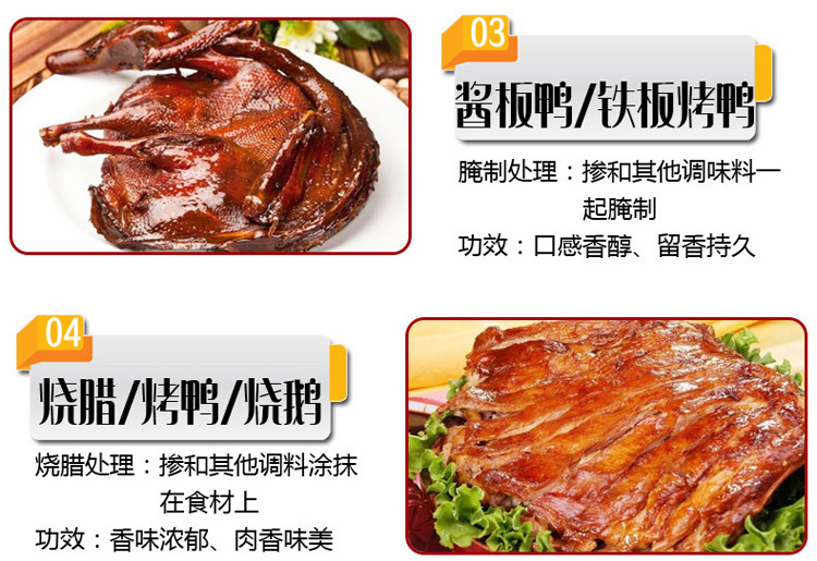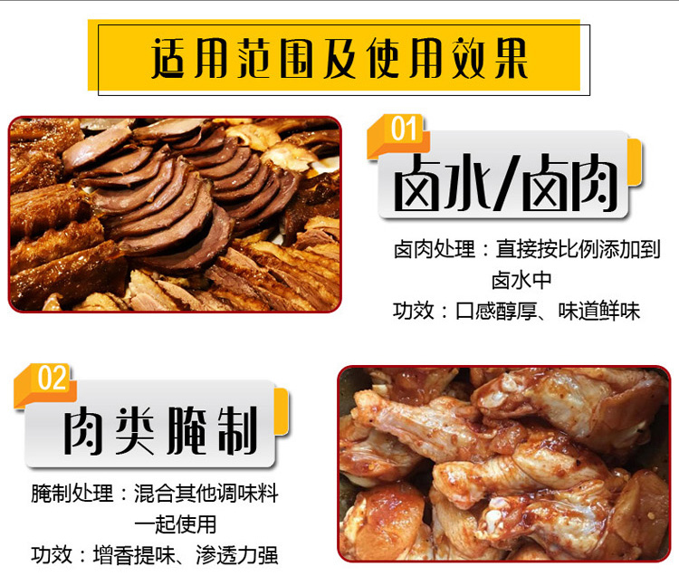 【应用范围】用于肉制品、烧菜、泡菜、腌卤(肉制品、豆制品、禽蛋制品),火锅调汤等食品加香。