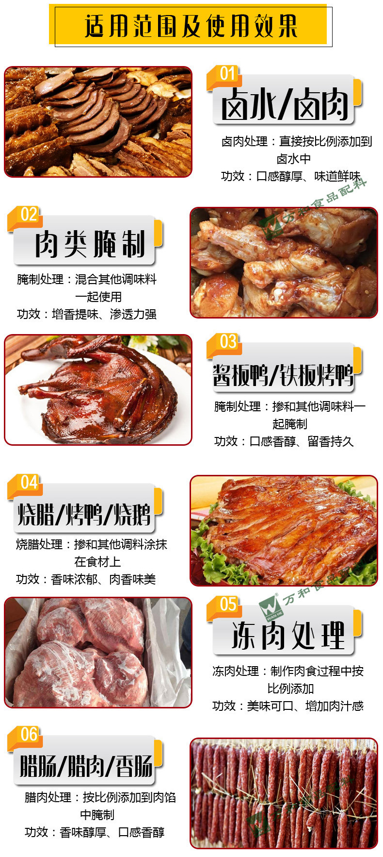 【应用范围】肉制品、火锅底料、素食、调高汤、清汤、卤制品、包陷、烧菜