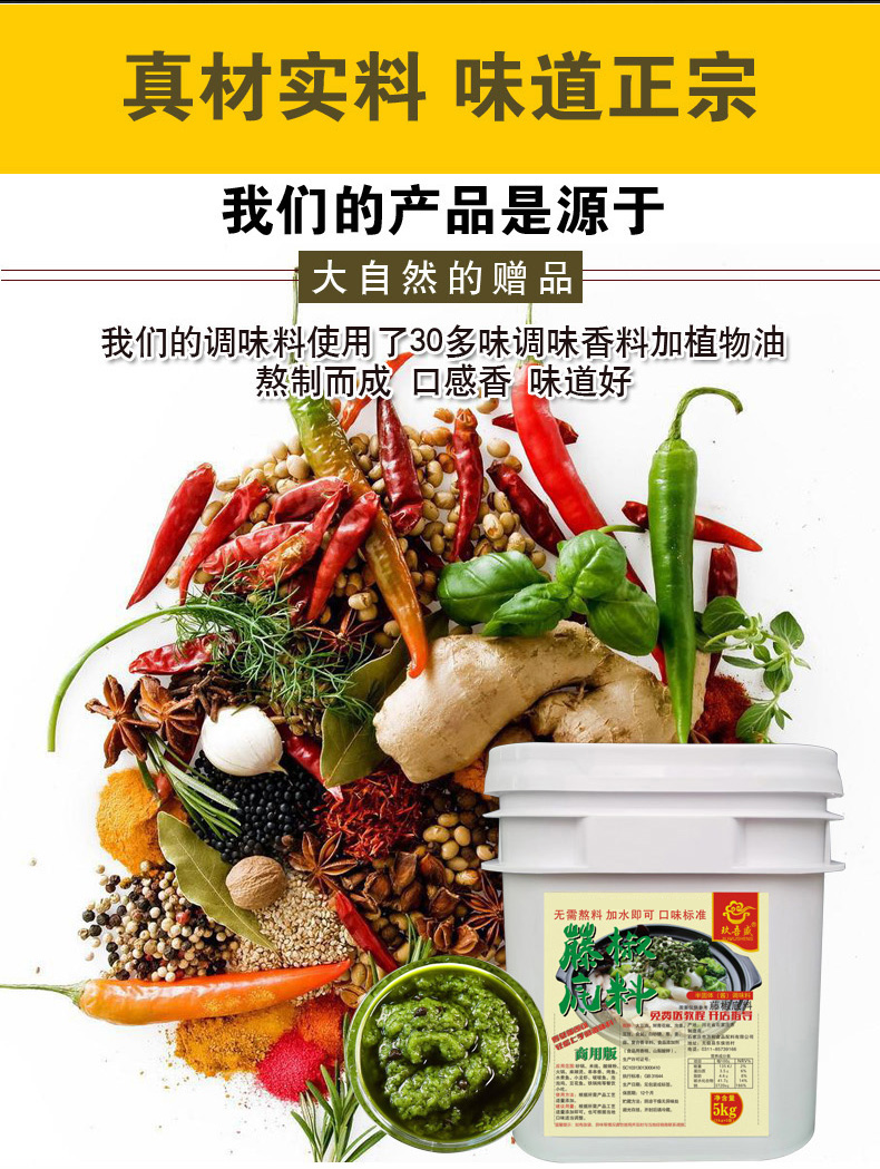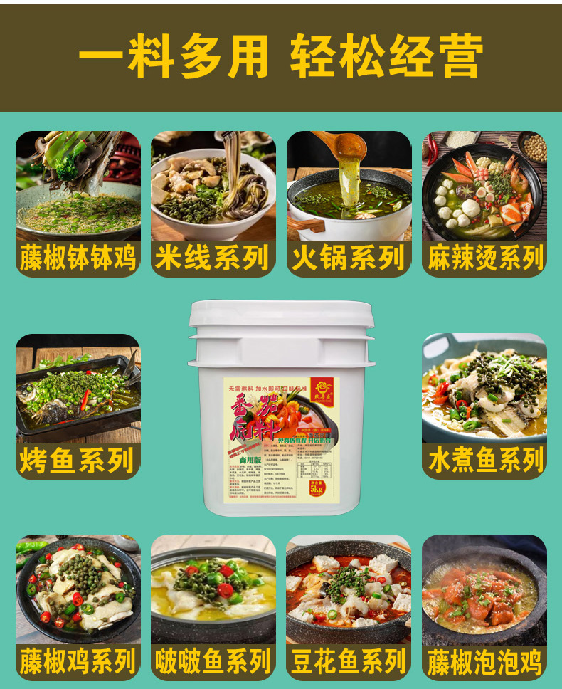 精选四川当地食材,传统四川烤鱼风味,色泽红亮,香辣、微麻,一料在手不用愁!成菜后鲜香细腻、麻辣适中、焦香酥脆、令人食欲大开、百吃不厌。